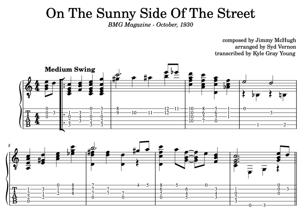 BMG Magazine was started in 1903 by Clifford Essex in London, England. They specialized in articles and sheet music for banjo, mandolin, and guitar, hence the initials BMG. They began publishing solos for plectrum guitar in 1928 and by 1930, a new plectrum guitar solo appeared almost every month. From the 1920s through the 1970s, there are about 400 plectrum guitar solos and duets. I'm steadily making my way through entabulating these to present them to a new audience today. The difficulty on these is intermediate and up. For version three of this eBook, there are 80 different tunes presented in standard notation and tablature. They span from the earliest plectrum tunes in the late 1920s through the mid 1970s. Nothing has been removed from the first three versions.