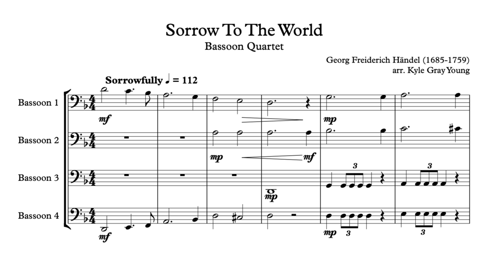 Please let me know if you make any recordings or have any performances with these arrangements. Please let me know if you have any requests, I’d love to hear from you! There are mp3s of midi renditions of these arrangements included with each tune. You can hear the mp3s on Soundcloud: https://soundcloud.com/kylegrayyoung/sets/christmas-bassoon-ensembles