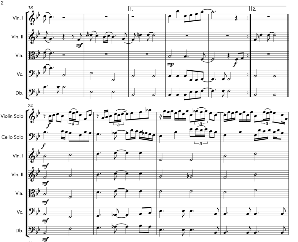 The classic Beatles song arranged for string orchestra. Violin 1, violin 2, viola, cello, double bass, plus violin and cello soloists. Violin and cello solos have some difficult passages, please see the thumbnails. Score is three pages, each part is one page, everything is included in one PDF.